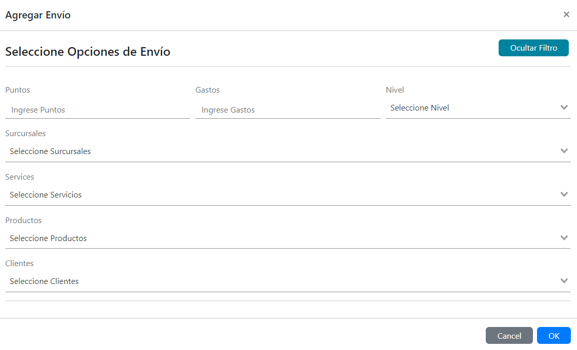 - Servicios: Puedes seleccionar que la notificación sea enviada solo a los clientes que hayan utilizado un servicio específico.