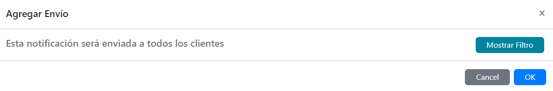 Para enviar una notificación debes hacer clic en el botón "Agregar Envío". Puedes enviar las notificaciones a todos tus clientes o segmentar el envío mediante filtros.