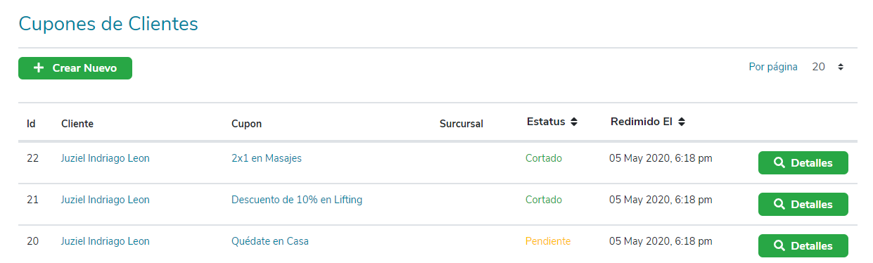 En esta sección podrás crear un cupón exclusivo para un cliente, el nuevo cupón se mostrará recortado en esta lista automáticamente y aparecerá en la sección Mis Cupones del cliente.