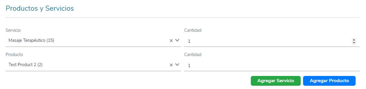 En esta sección puedes editar los servicios y productos que se prestarán al cliente en la cita solicitada. También dispones del botón "Agregar Servicio" y "Agregar Producto", que incluye un renglón para seleccionar el servicio y el producto que deseas agregar a la cita y especificar la cantidad que será incluida en la cita.