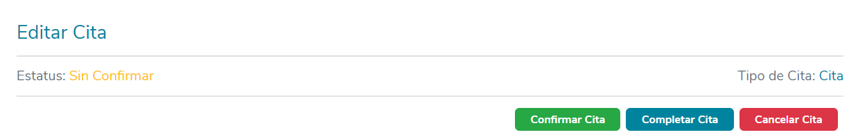 En esta sección puedes modificar ese estatus al hacer clic en los botones "Confirmar Cita", "Completar Cita" o "Cancelar Cita"; que están ubicados en la parte superior derecha de la pantalla.
