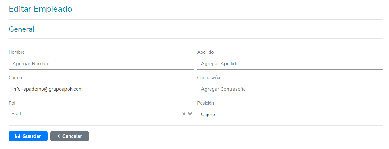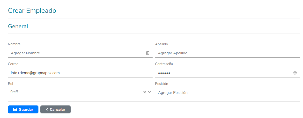 - Correo Electrónico: Este es el correo electrónico que usará el empleado para iniciar sesión en el administrador.