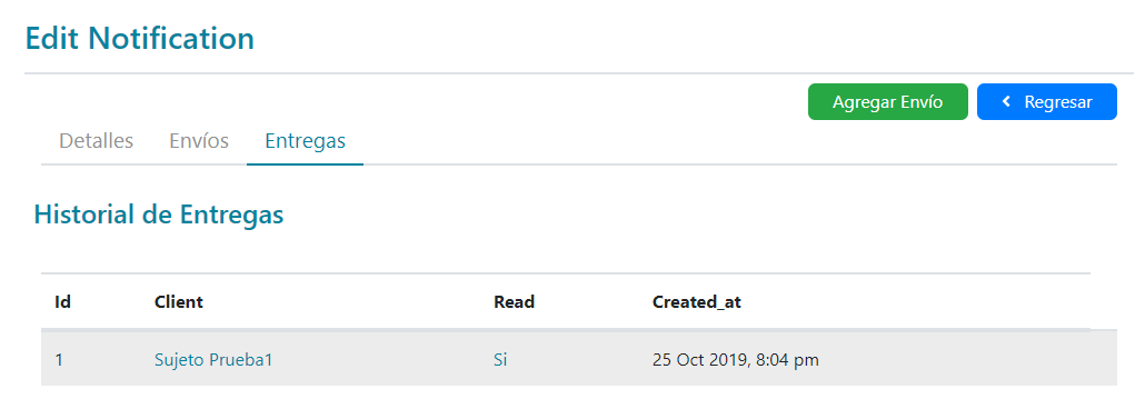 La sección Entregas muestra un listado con las notificaciones entregadas a los clientes. En el listado puedes consultar la siguiente información: