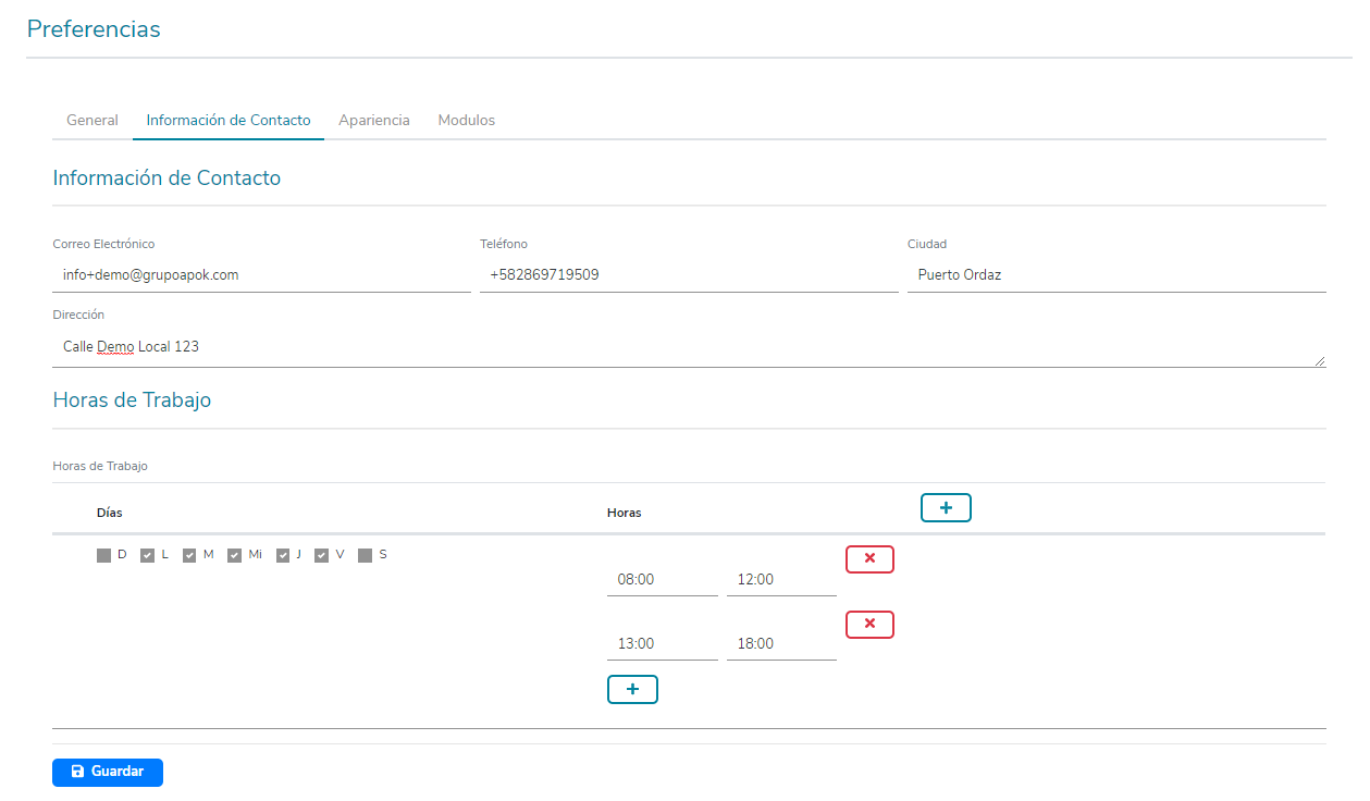 El formulario está dividido en dos partes: Información de contacto y Horas de Trabajo u horario de Atención al Cliente.