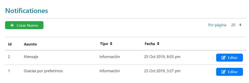 Para crear una nueva notificación debes pulsar el botón "Crear Nuevo" y completar la información solicitada.