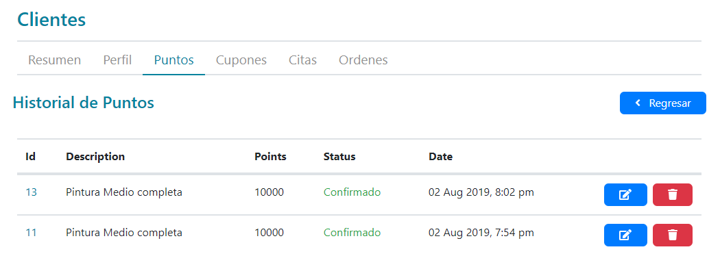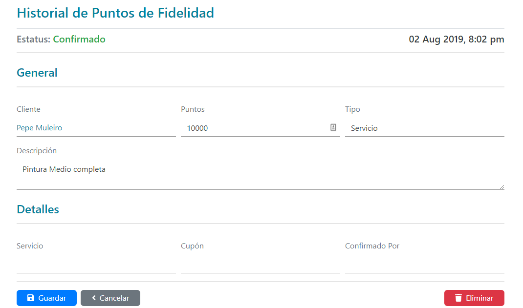 - Descripción: Nombre del servicio que le ha otorgado puntos al cliente.