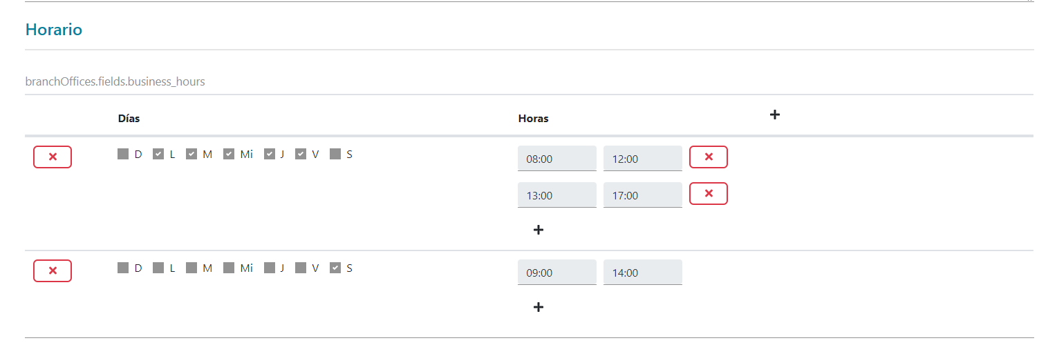 Selecciona los días de la semana en los cuales estará abierta la sucursal, luego haz clic sobre el símbolo "+" para añadir la hora (el formato de la hora debe ser el de 24 h).